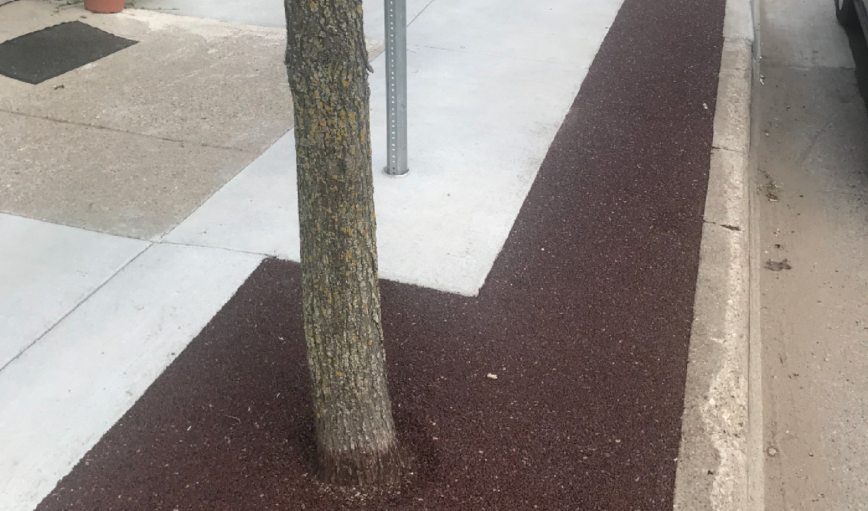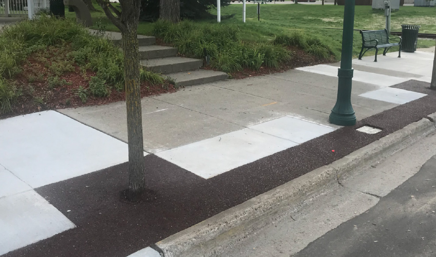 Construct a new method for directing runoff from storm events while maintaining an ADA accessible sidewalk and allowing healthy growth for city trees. Porous Pave XL was the perfect fit due to the installation method of Porous Pave, being poured in place allowed the city to create a well designed maintenance strip and tree surround in one seamless installation.