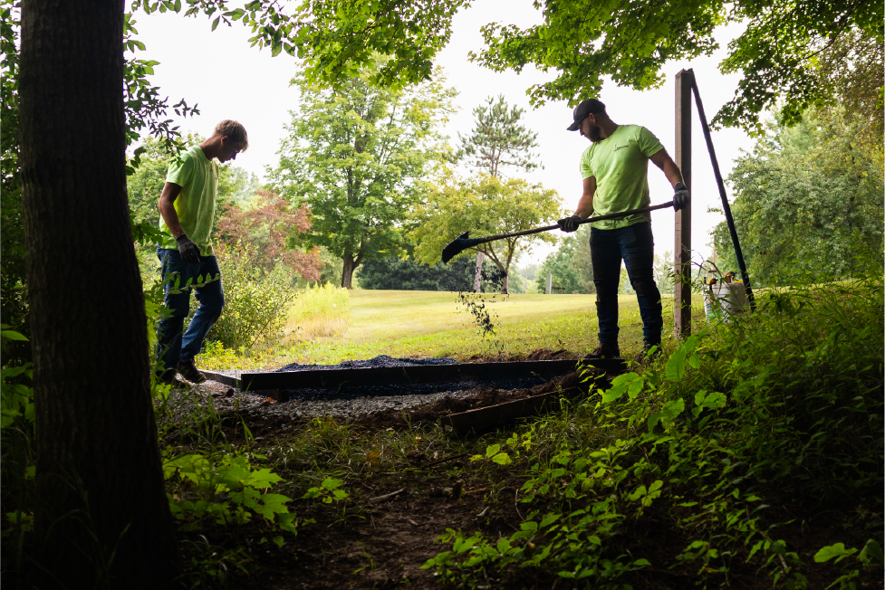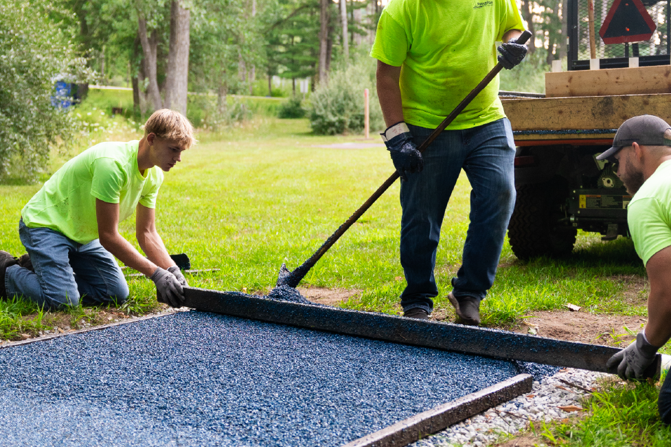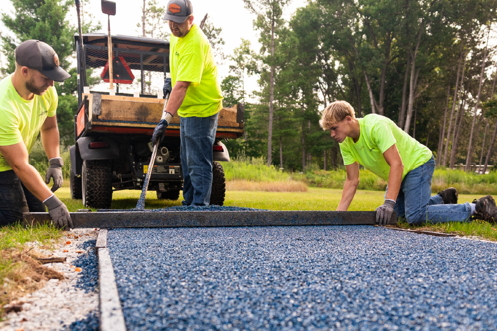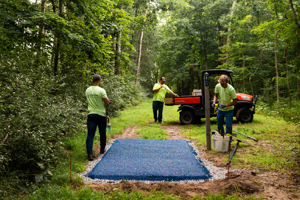 Porous Pave Inc handled the installation in two phases, day 1 was all of the blue tees and day the remaining red tees. The team utilized a mixer mounted on a trailer along with a Kubota UTV to easily access the entire site and efficiently install all 36 tee pads in two days.